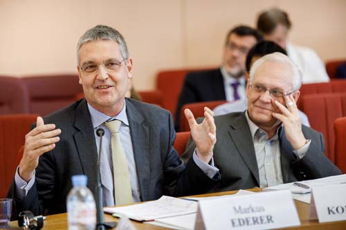 Экспертная встреча прошла в формате двух секций. На первой секции рассматривались три интеграционных проекта на евразийском пространстве. Модератором секции выступил Ал.А. Громыко. В рамках секции выступили с докладами В.О. Никишина – Член Коллегии (Министр) по торговле Евразийской экономической комиссии; Маркус Эдерер (Markus Ederer) – Посол Европейского союза в России; Н.Б. Кондратьева – руководитель Центра экономической интеграции Института Европы РАН; Марк Франко – почётный Посол, старший научный сотрудник Королевского института международных отношений – Эгмонт; А.В. Русакович – председатель правления Центра изучения внешней политики и безопасности, заведующий кафедрой дипломатической и консульской службы Белорусского государственного университета; Евгений Юрьевич Винокуров – главный экономист Проектного блока Евразийского фонда стабилизации и развития, О.А. Романов – первый проректор Гродненского государственного университета имени Янки Купалы.