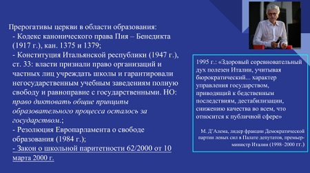 Вероника Евгеньевна Язькова в своём докладе рассмотрела принцип «паритетности» как альтернативный государственному вариант образования на примере «паритетных школ» Италии – одной из моделей церковно-государственного взаимодействия в Италии. Католическая педагогика – заметное явление в истории страны, которое нередко расценивалось с тенденциозных позиций. Эта проблема необыкновенно актуальна и сегодня. Принятие в 2000 г. закона о школьной «паритетности» стало итогом длительной борьбы Церкви со сторонниками секуляризма. Вместе с тем, невзирая на формальное уравнивание конфессиональных школ с публичными, государство не предоставило гражданами возможности в полной мере реализовать предоставленное им конституцией право свободного выбора типа образования и воспитания детей. Не способствуют популярности «паритетного» образования и распространённые в общественном сознании представления о неконкурентоспособности, элитарности католической школы, которая воспринимается чуть ли не как анахронизм в эпоху, когда ставшее государственной монополией образование унифицировано на национальном уровне, позиционируется как «нейтральное» и политкорректное. Означает ли сокращение числа «паритетных» школ постепенное отмирание альтернативного государственному образования?