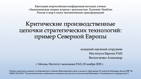 Александр Васильченко выступил с докладом «Критические производственные цепочки стратегических технологий: пример Северной Европы». В своем сообщении докладчик отметил значимость критических сырьевых материалов в экономике нового технологического уклада. Была подчеркнута высокая роль стран Северной Европы в ресурсном сегменте стратегических секторов европейской экономики: производстве электродвигателей, ветряных турбин, 3D-принтеров. Автором была предложена методика определения «критических производственных цепочек», которая позволяет выявлять уязвимости глобальных цепочек стоимости и формировать приоритеты национальной промышленной политики. Отмечено, в последние десять лет странам Северной Европы удалось замкнуть на себе три дополнительные критические цепочки.