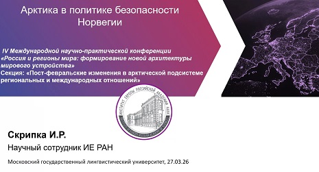 26–27 марта 2026 года научный сотрудник Отдела страновых исследований Института Европы РАН И.Р. Скрипка, младший научный сотрудник Отдела М.Д. Туник и младший научный сотрудник Отдела европейской безопасности Р.Е. Жилин приняли участие в IV международной научно-практической конференции «Россия и регионы мира: формирование новой архитектуры мирового устройства».